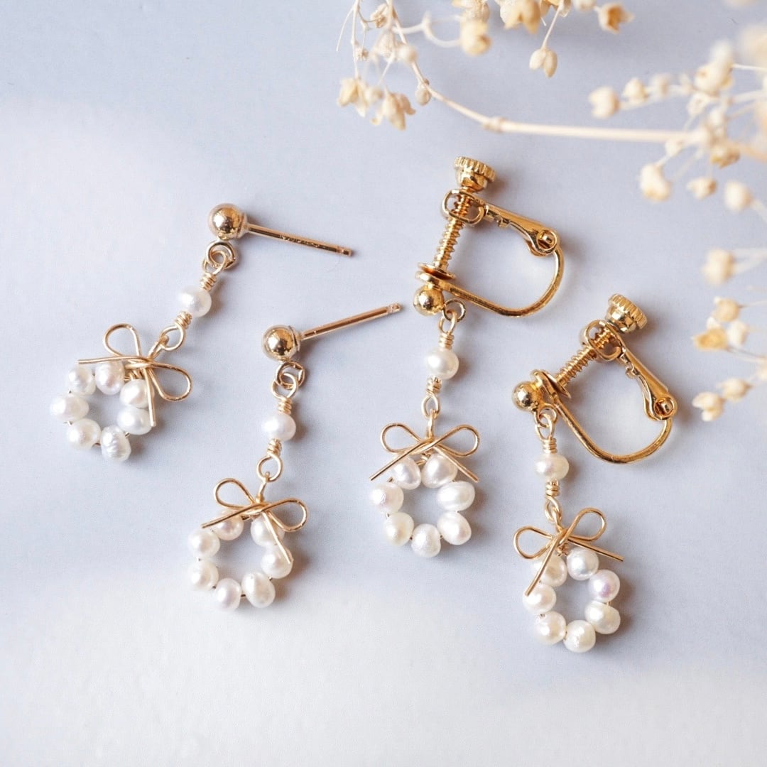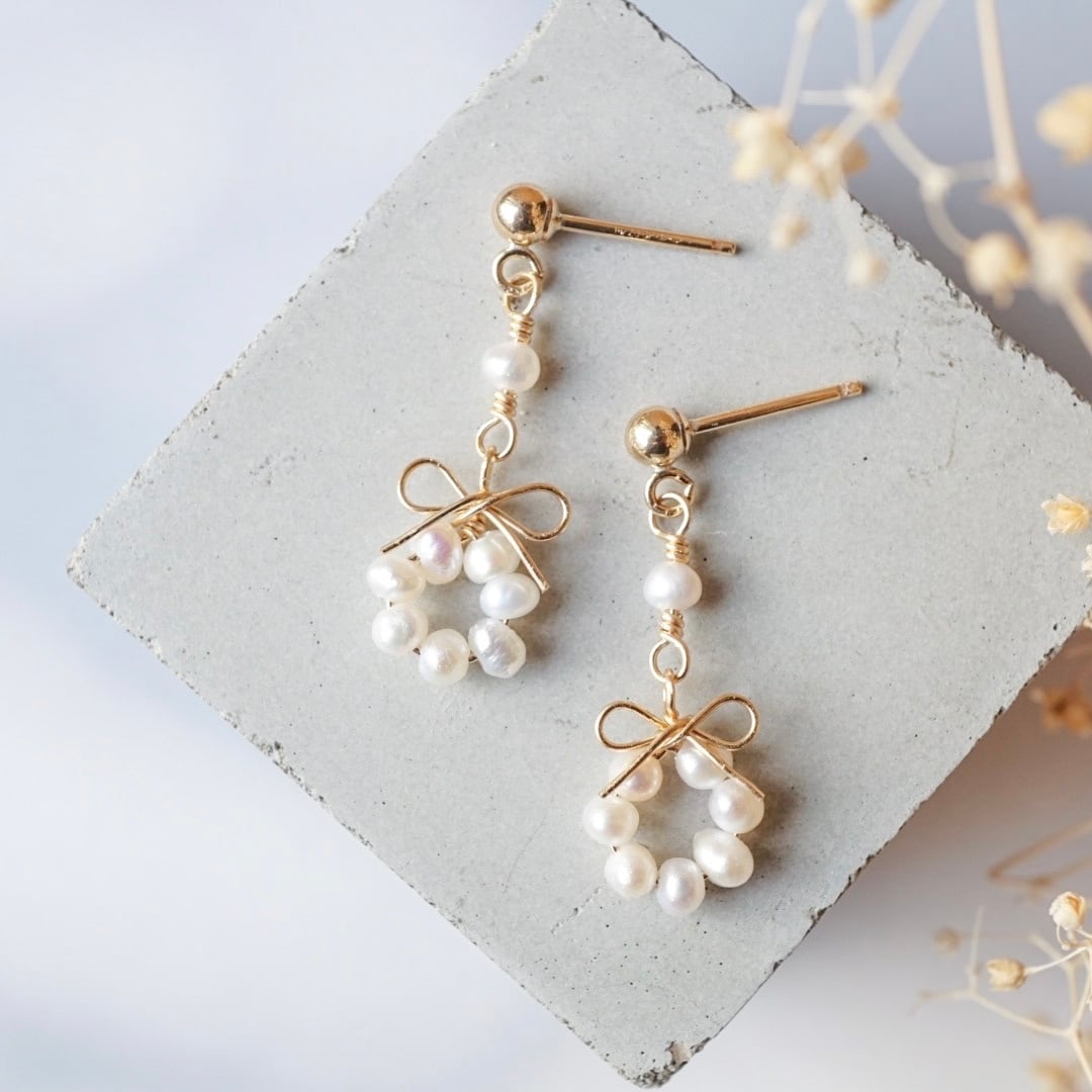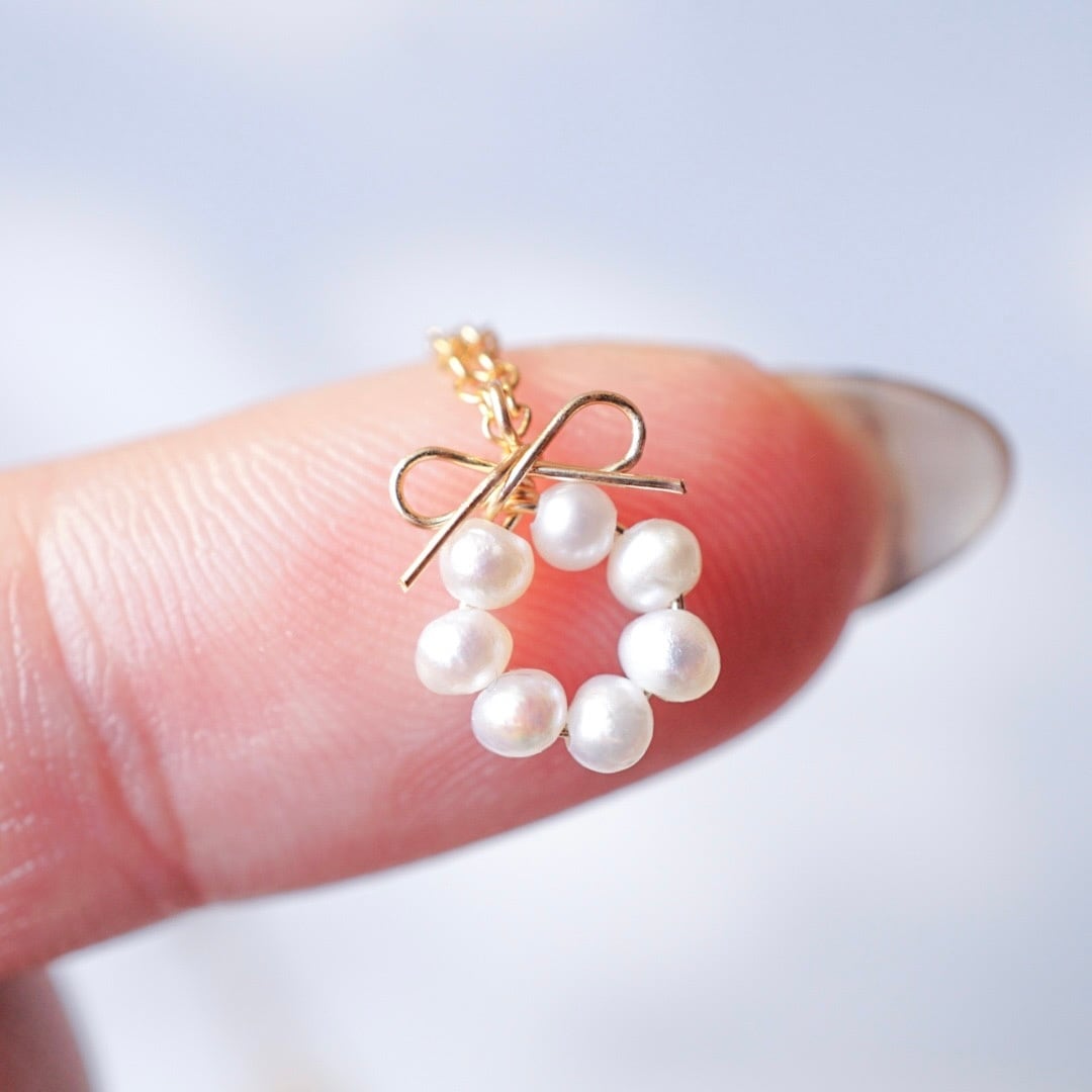 小さなリースのように並べた淡水パールを添えて。