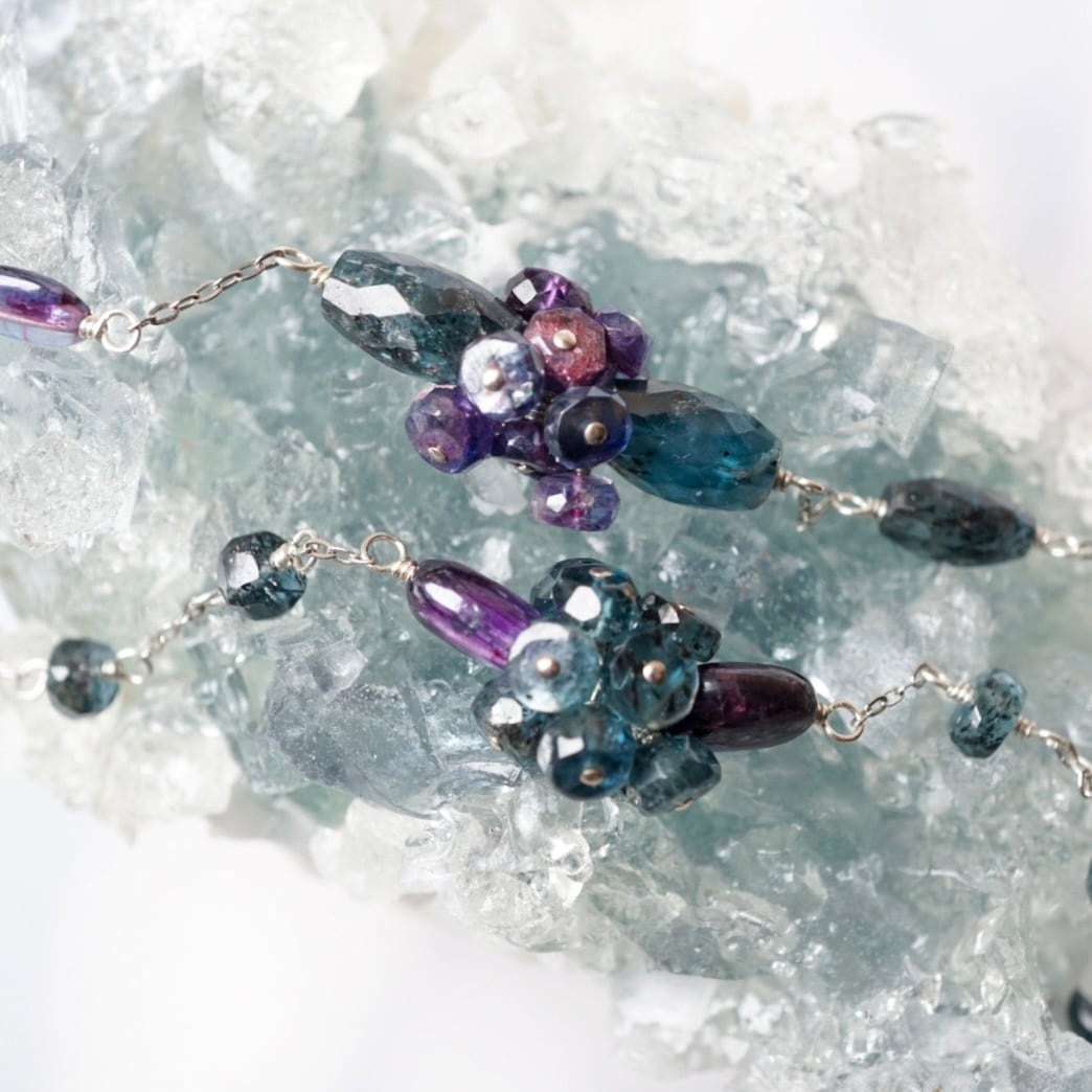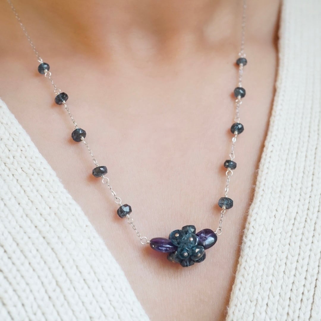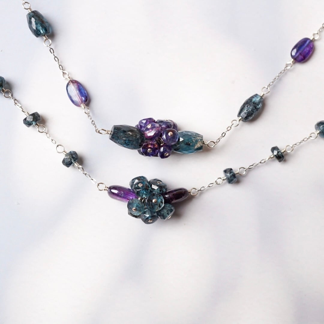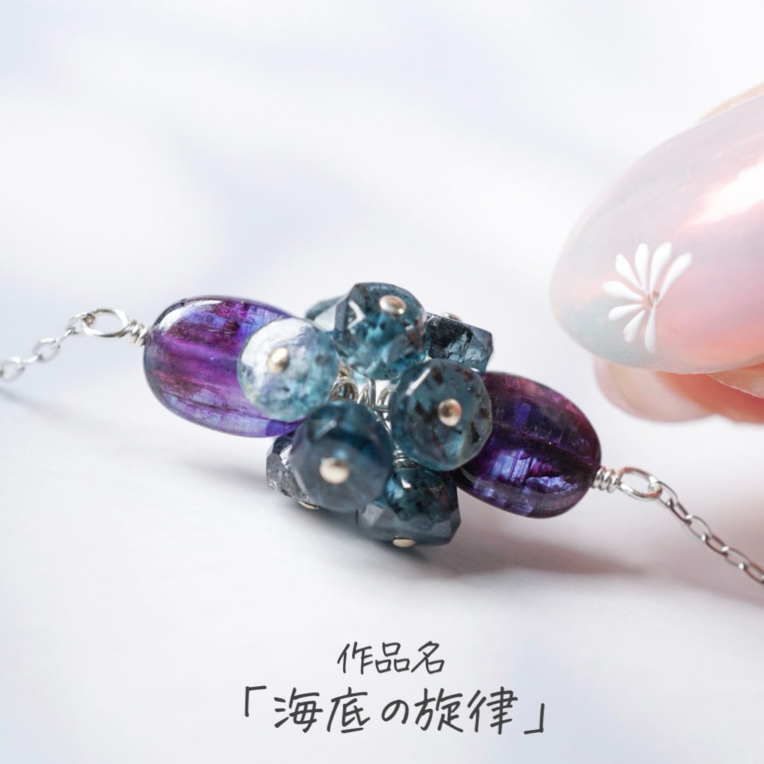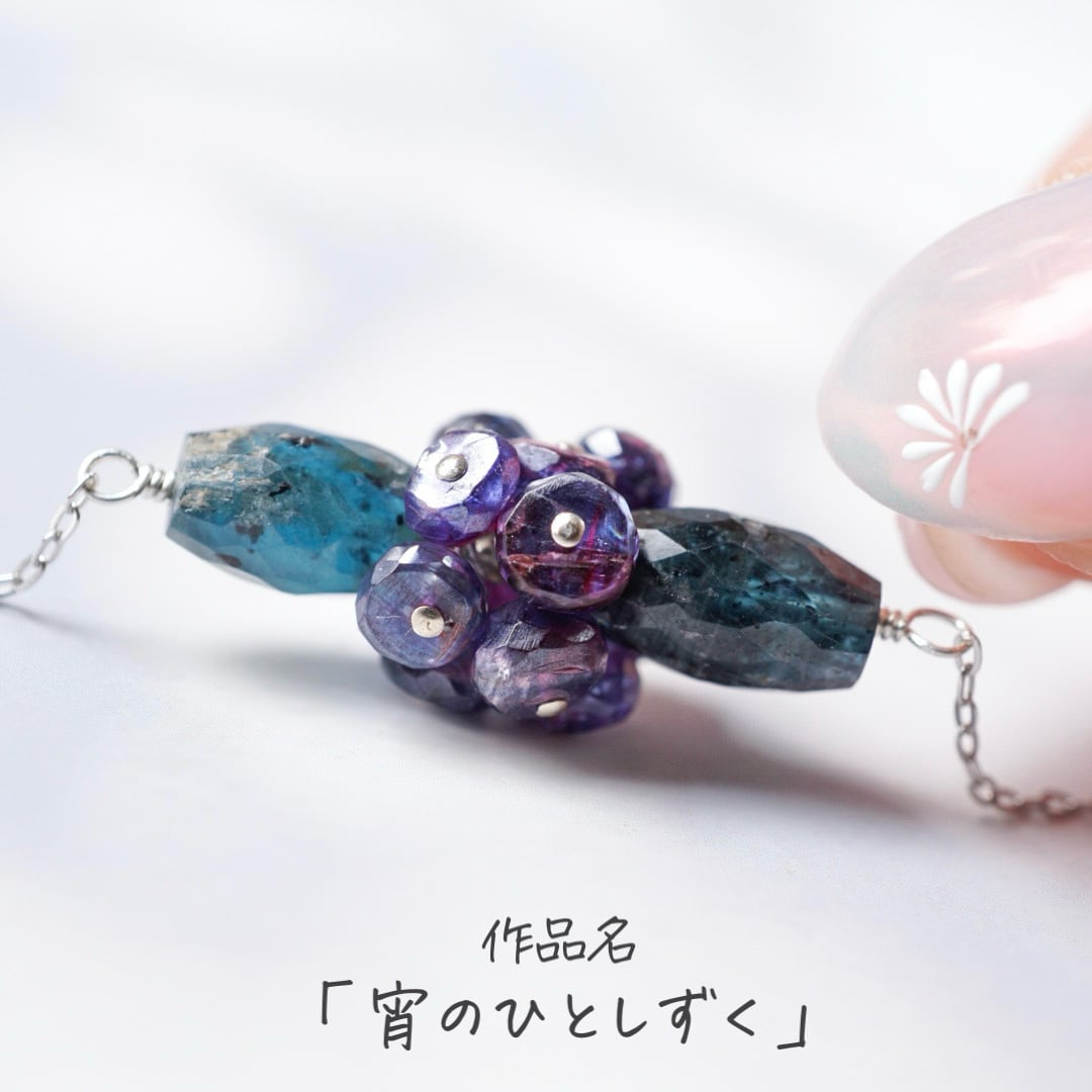 ミスティックカイヤナイトの透明感ある艶めきが首元でそっと響き合います。