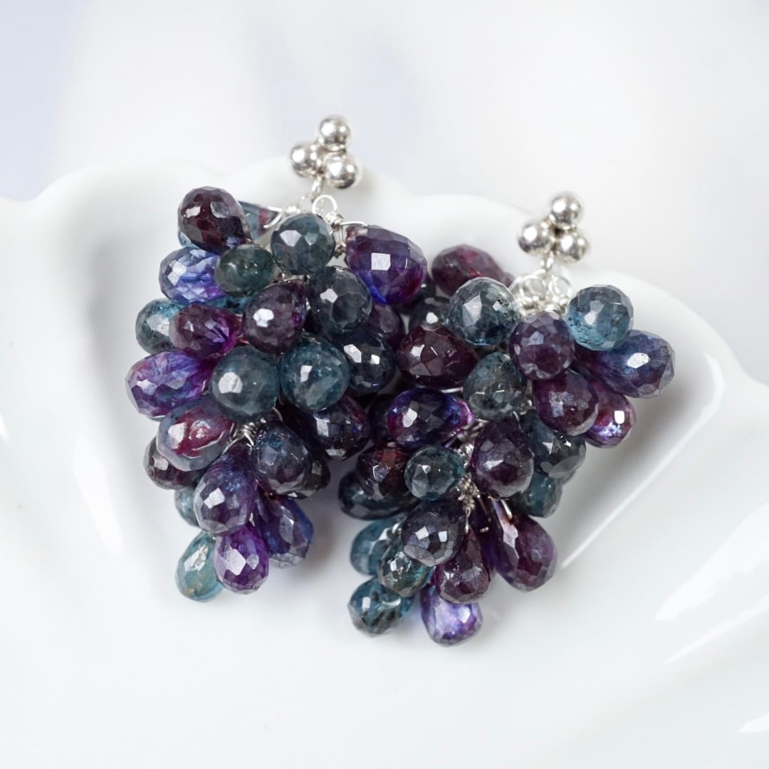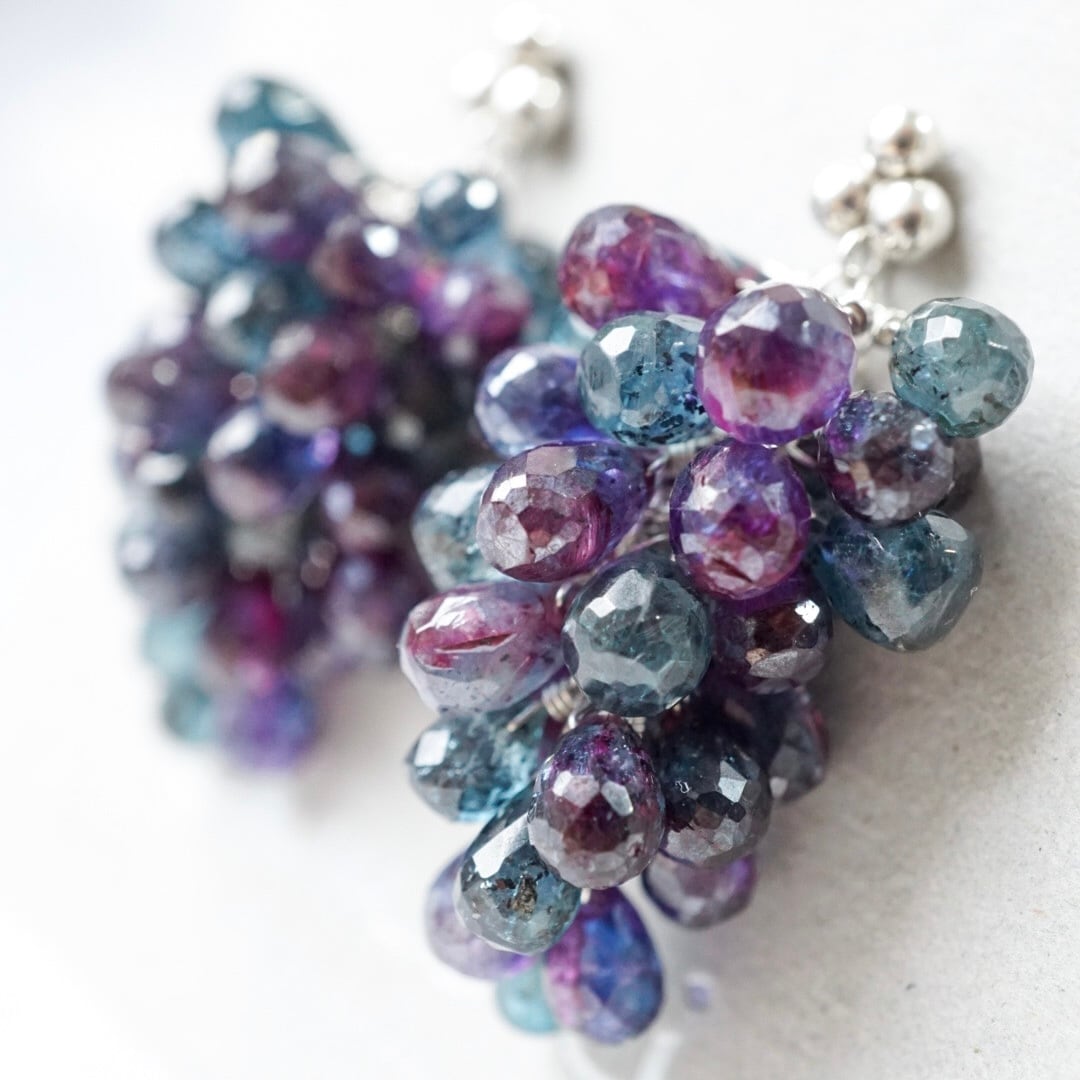 熟れた葡萄のような、濃く深い色合いの天然石を束ねた耳飾り。