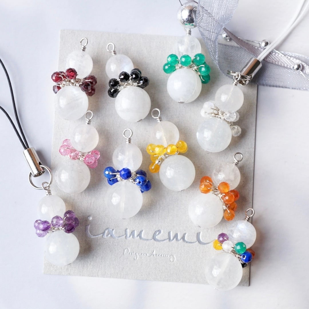 【ストラップ】「9色のマフラーを巻いた雪だるま」天然石 誕生石 ムーンストーン メンカラ 推し活 プチギフト プレゼント