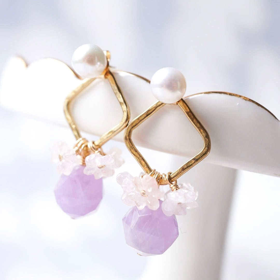 【2wayピアス】「桜の花束」天然石 モルガナイト アメジスト パール ピンク 春 入学式 卒業式 フォーマル K18 K14 14kgf 金属アレルギー対応