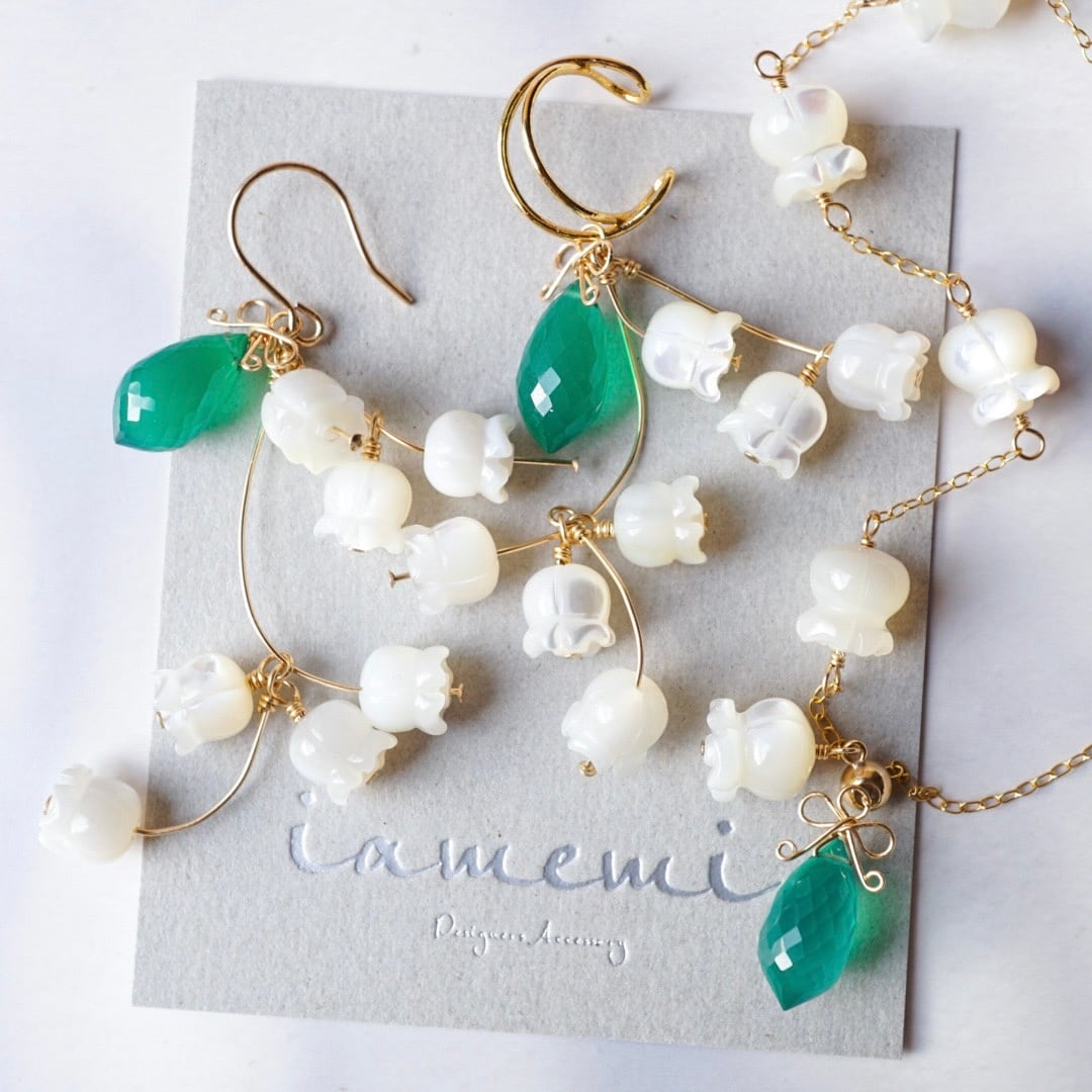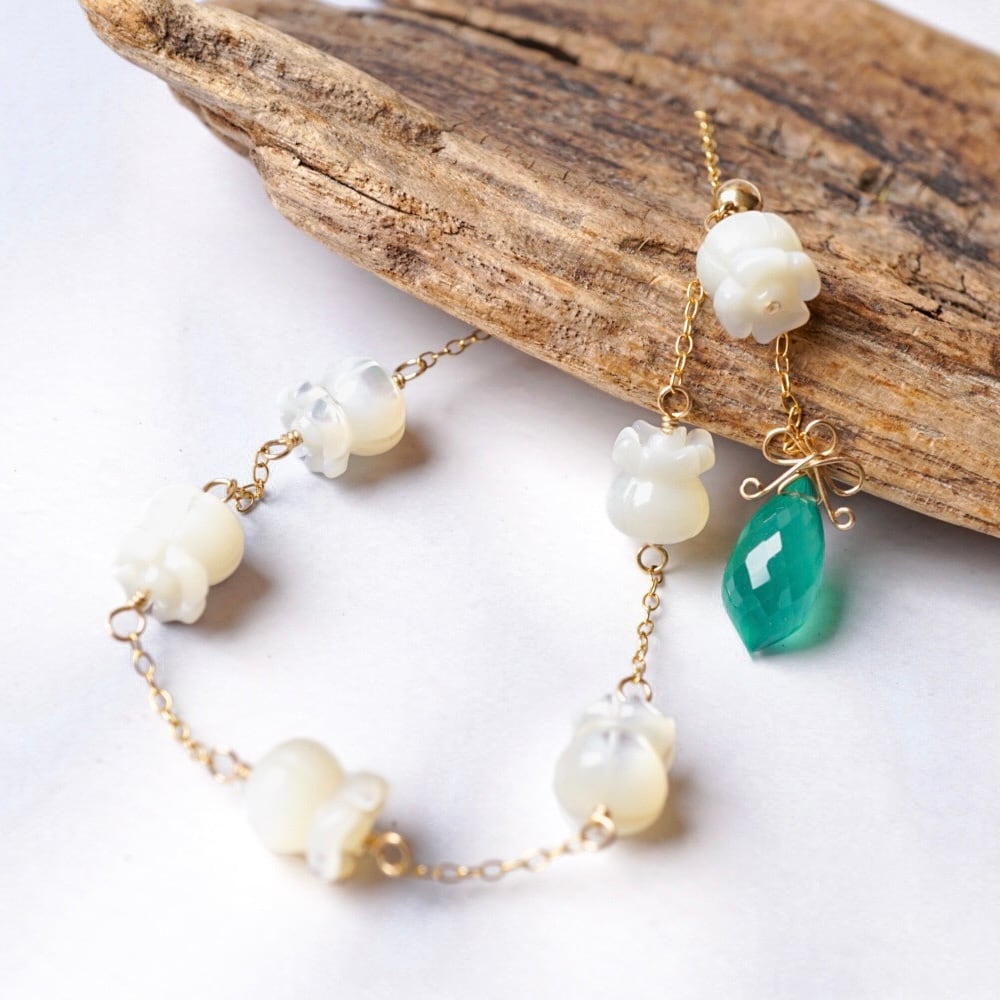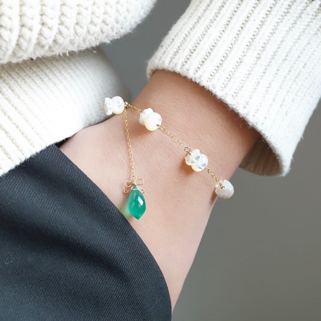 「すずらん」ブレスレット グリーンオニキス シェル 天然石 リボン 春 白 ホワイト 母の日 14kgf アレルギー対応 ギフト